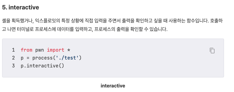쉘에 대한 권한을 취득해야하는 문제이므로 interactive를 통해서 살펴봐야한다. 어떤 함수를 써야하는지에 대한 내용은 pwntools의 깃헙에서 확인하거나 드림핵 강의(https://learn.dreamhack.io/59#4) 에서도 확인할 수 있다.